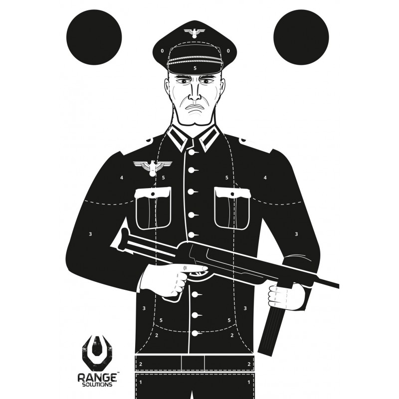 Tarcze Strzeleckie RS-NAZI, przygotowane z myślą o tych, którzy na strzelnicę wybierają się dla przyjemności. Tarcze wydrukowane są na papierze offsetowym 80g. Na tarczach nie znajdziemy symboli zakazanych prawem. Na sylwetce umieszczone zostały strefy punktowe, a na górze po prawej i lewej stronie czarne koła.